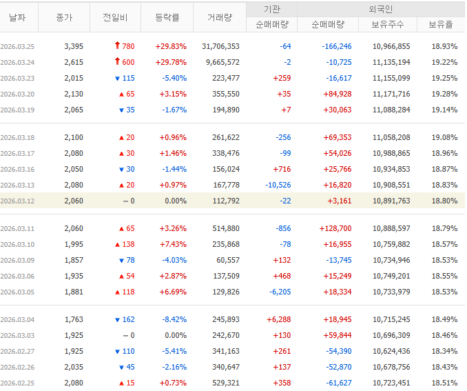 - 수급 동향: 최근 1개월간 외국인이 약 41만 주 이상을 집중 매집하며 주가 상승을 주도하고 있습니다. 3월 말 들어 개인 물량을 외인이 받아내는 손바뀜 현상이 뚜렷합니다.