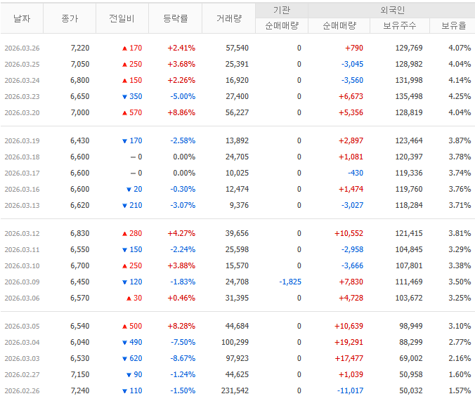 - 매매 동향: 기관의 참여는 미미하지만, 외국인은 3월 중순부터 5거래일 연속 집중 순매수를 보이며 무상증자 공시 전 선취매 흐름을 나타냈습니다. 외국인 추정 평균 단가는 약 6,600원 ~ 6,700원 선입니다.