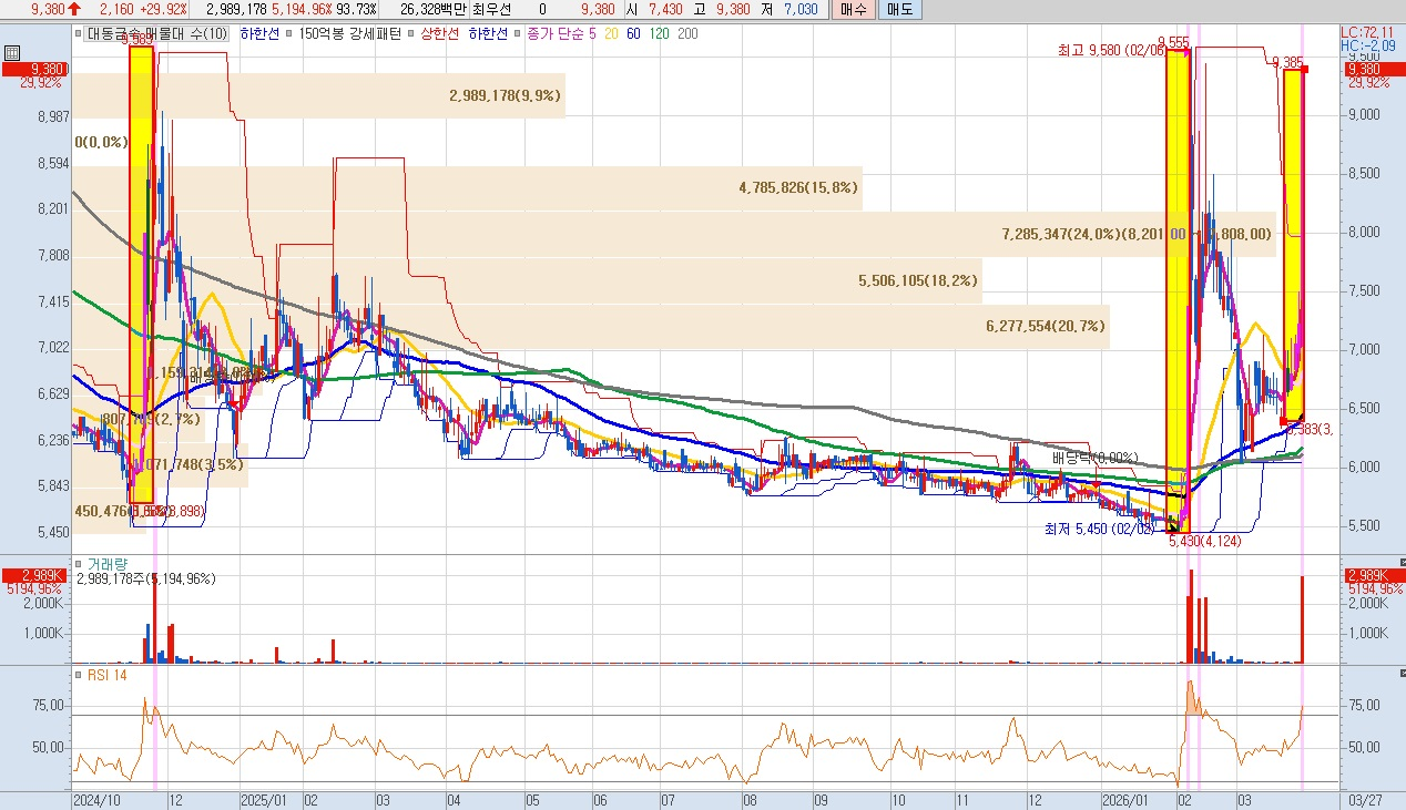 - 주요 매물대 및 저항선: 현재 9,580원(전고점)이 단기 저항선으로 작용하고 있습니다. 지지선은 매물대가 집중된 7,000원 ~ 8,200원 구간입니다.