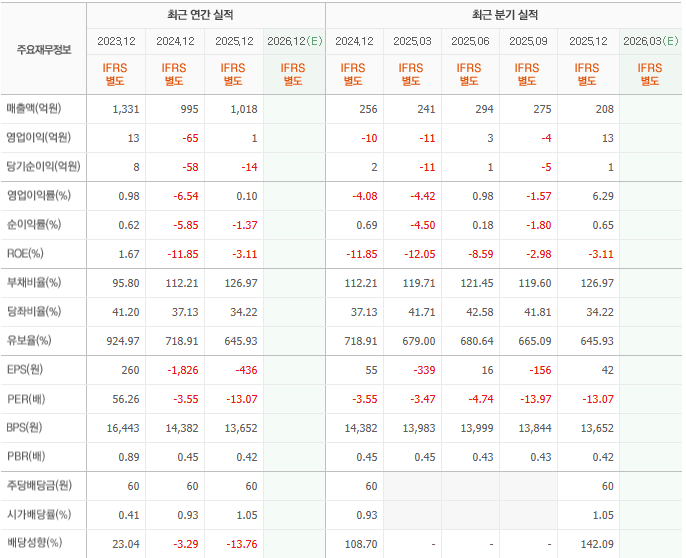 - 배당 정책: 실적 변동성에도 불구하고 주당 60원의 배당을 꾸준히 유지하고 있습니다. 적자 상황에서도 배당을 지속하며 주주 친화적인 성향을 보여왔습니다.