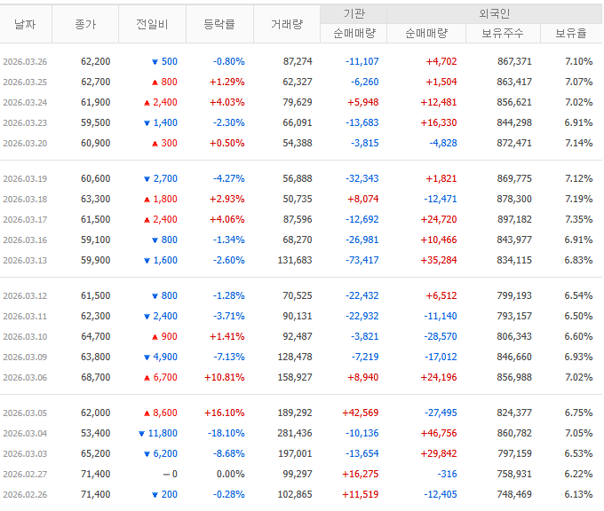 | 2026-03-27 | 외인·기관 양매수에 9%대 급등 (+9.16%) | 2025년 흑자 전환 및 2026년 해외 공장 가동률 정상화 기대감 반영 |