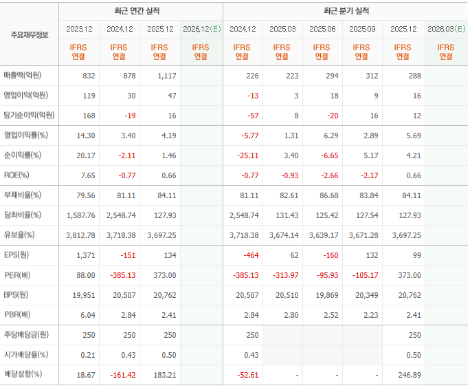 - 수익성 개선: 2024년 일시적인 당기순이익 적자를 기록했으나, 2025년 다시 흑자 전환(16억 원)에 성공하며 턴어라운드 기조를 확립했습니다.
