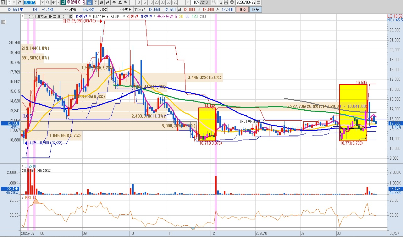 • 지지 및 저항: 강력한 바닥 지지선은 10,700원대이며, 11,80012,000원 선이 1차 지지선 역할을 합니다. 상단 13,80014,800원 구간은 누적 매물 비중이 26.9%에 달하는 핵심 저항대로, 이곳의 돌파 여부가 향후 상승 폭을 결정할 전망입니다.