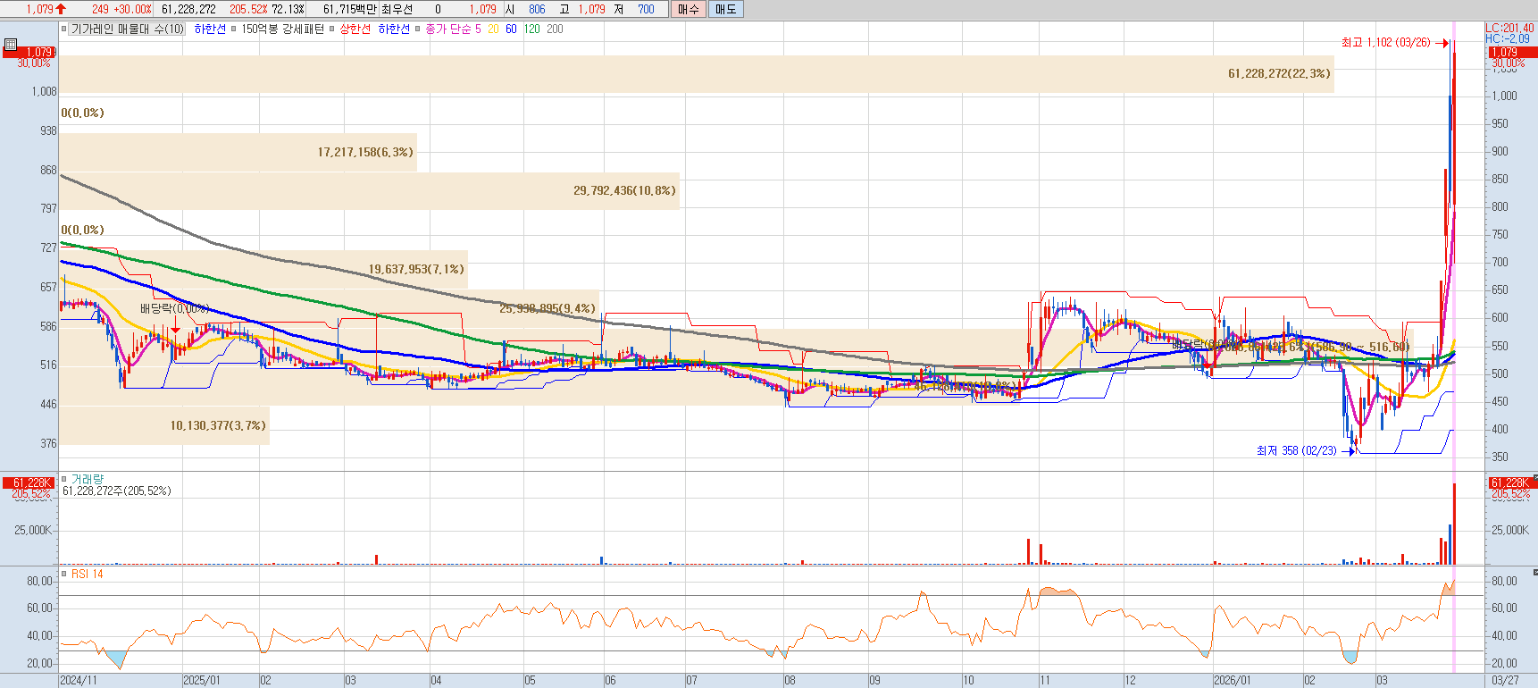 - 시세 및 거래량: 현재가는 1,079원으로 상한가를 기록하며 장기 하락 추세를 강력하게 돌파했습니다. 특히 약 6,122만 주의 역대급 거래량이 동반되며 바닥권에서 '스마트 머니'가 유입된 강력한 추세 전환 신호를 보이고 있습니다.