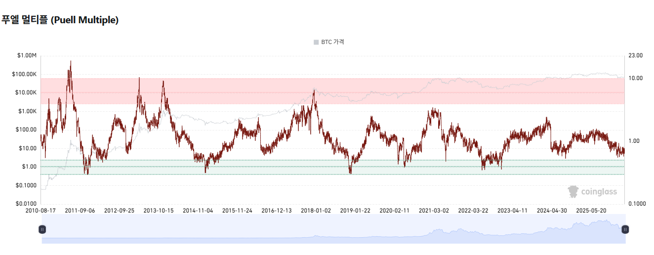 - 푸엘 멀티플 = 오늘의 일일 채굴 수익(USD) / 최근 365일 평균 일일 채굴 수익(USD)