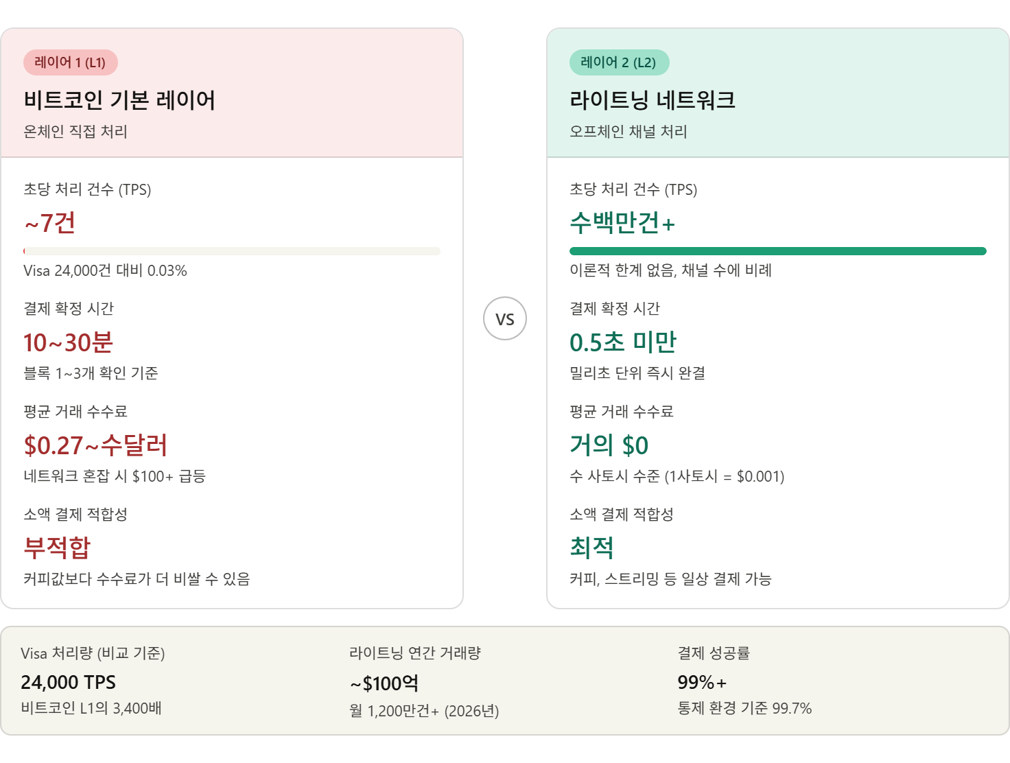 비트코인 기본 레이어(L1)는 약 10분마다 블록 하나를 만들고, 초당 처리할 수 있는 거래가 고작 7건이었습니다. Visa가 초당 24,000건을 처리한다는 걸 생각하면, 일상 결제 수단으로 쓰기엔 아예 구조가 다르다고 볼 수 있죠.