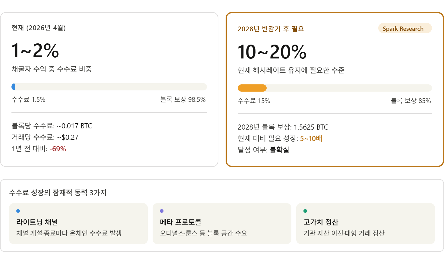 Spark Research의 분석에 따르면, 2028년 반감기 이후 현재 수준의 해시레이트를 경제적으로 유지하려면 수수료가 블록 보상의 10~20%를 꾸준히 차지해야 합니다. 현재 1~2%에서 10~20%로 5~10배의 성장이 필요하다는 말이 됩니다.