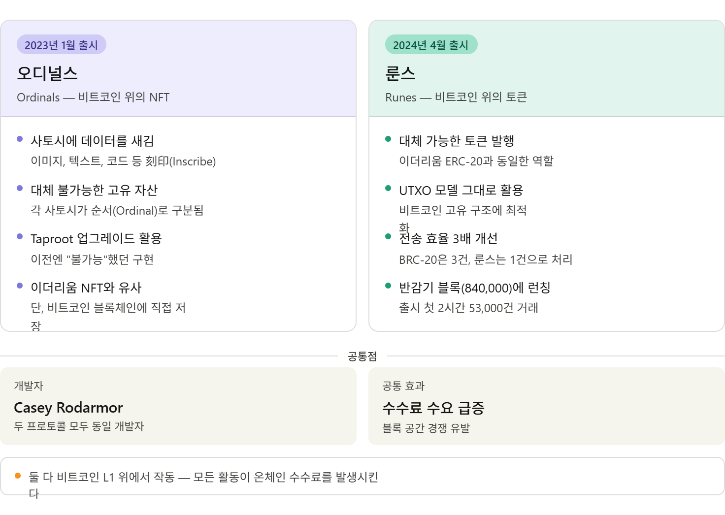 같은 Rodamor가 2024년 4월 비트코인 반감기 블록(840,000)에 맞춰 출시한 룬스는 비트코인 위의 대체가능 토큰의 표준입니다. 이더리움의 ERC-20(이더리움의 토큰 표준)에 해당하지만 비트코인의 UTXO 모델을 그대로 활용해 더 효율적이었죠. 기존 BRC-20(비트코인의 표준 토큰, ERC-20의 비트코인 버전) 토큰이 전송 한 번에 거래 3건이 필요했다면, 룬스는 1건으로 끝납니다.