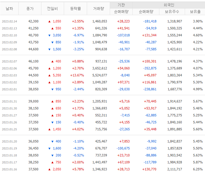 23.02.14 현재 외인 보유율은 3.9%입니다. 최근 1개월 간 기관과 외인은 순매도세를 보이고 있어 시장의 관심에서 아직은 멀다고 볼 수 있습니다. 다만, 위믹스 관련 이슈가 남아있기 때문에 다시금 이들이 유입될 수 있는지가 관건입니다.