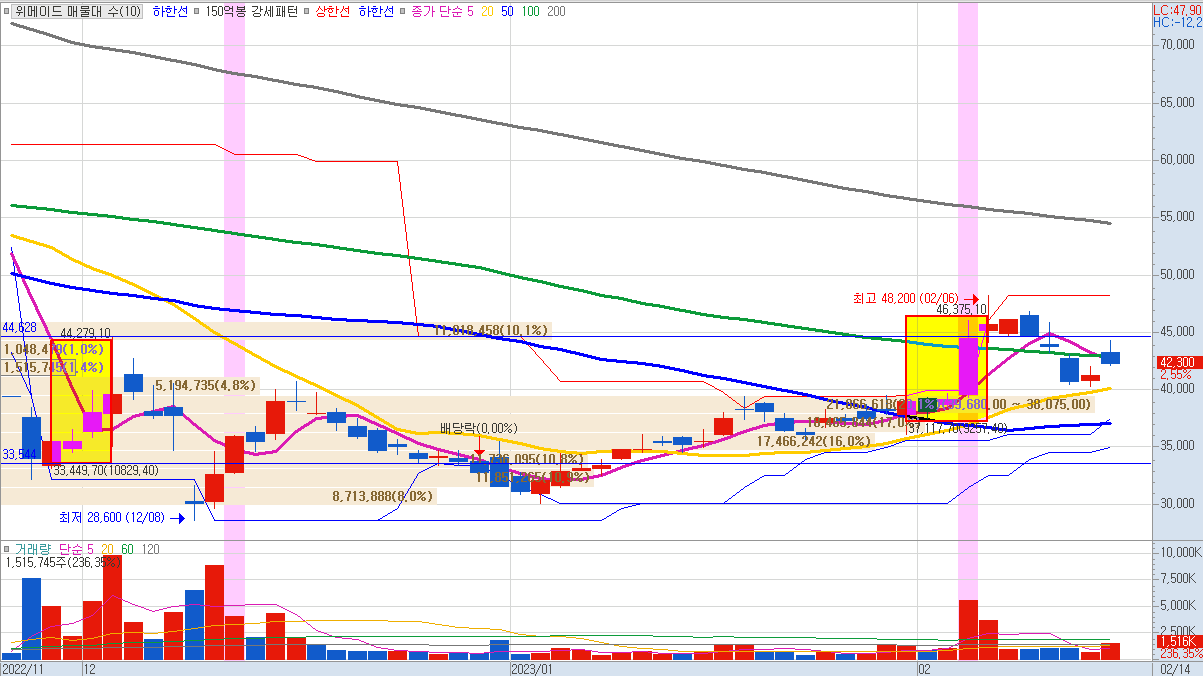 위메이드의 23.02.14 현재 주가는 42,300원으로 전일 대비 2.55%를 기록했습니다. 오늘의 상승은 CPI 지수 발표에 대한 기대감으로 볼 수 있습니다. 명일 단기 하락이 예상되나 재반등 후 전고점을 다시 두드릴 수 있을지 추적이 필요합니다.