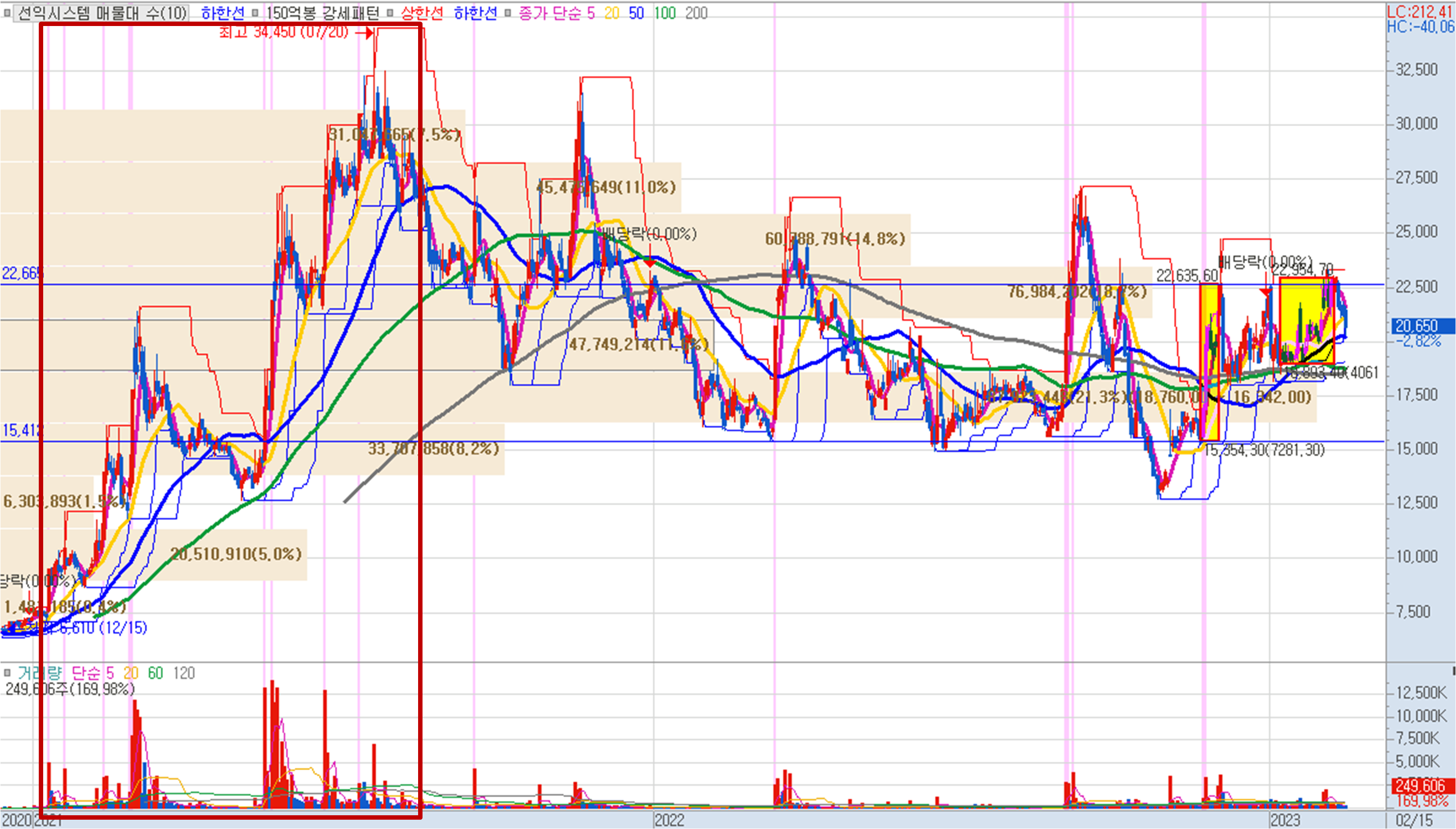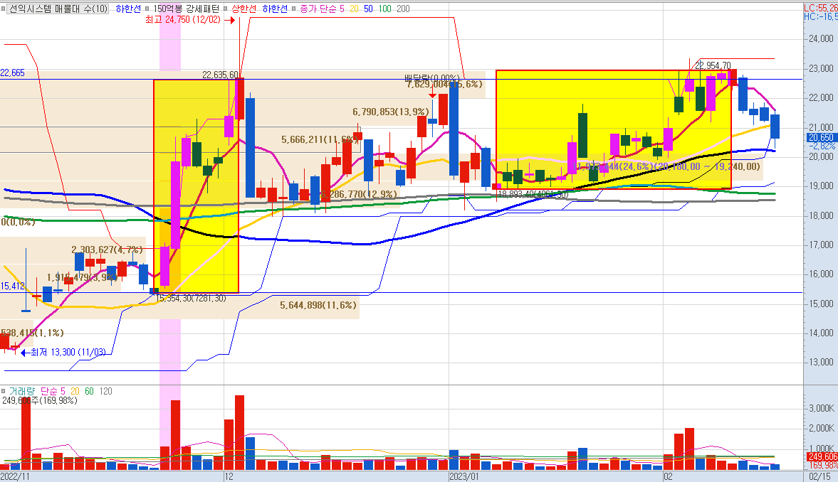 선익시스템의 23.02.15 기준 주가는 20,650원으로 전일 대비 -2.82%를 기록했습니다. 약 23,000원의 저항선에 부딪혀 현재 하락 중이지만, 앞으로 이어질 애플, 삼성전자, 구글 등 XR/VR 기기의 출시 일정에 맞춰 재차 반등 가능성이 있습니다. 이에 대한 지속적인 추적이 필요할 것으로 보입니다.