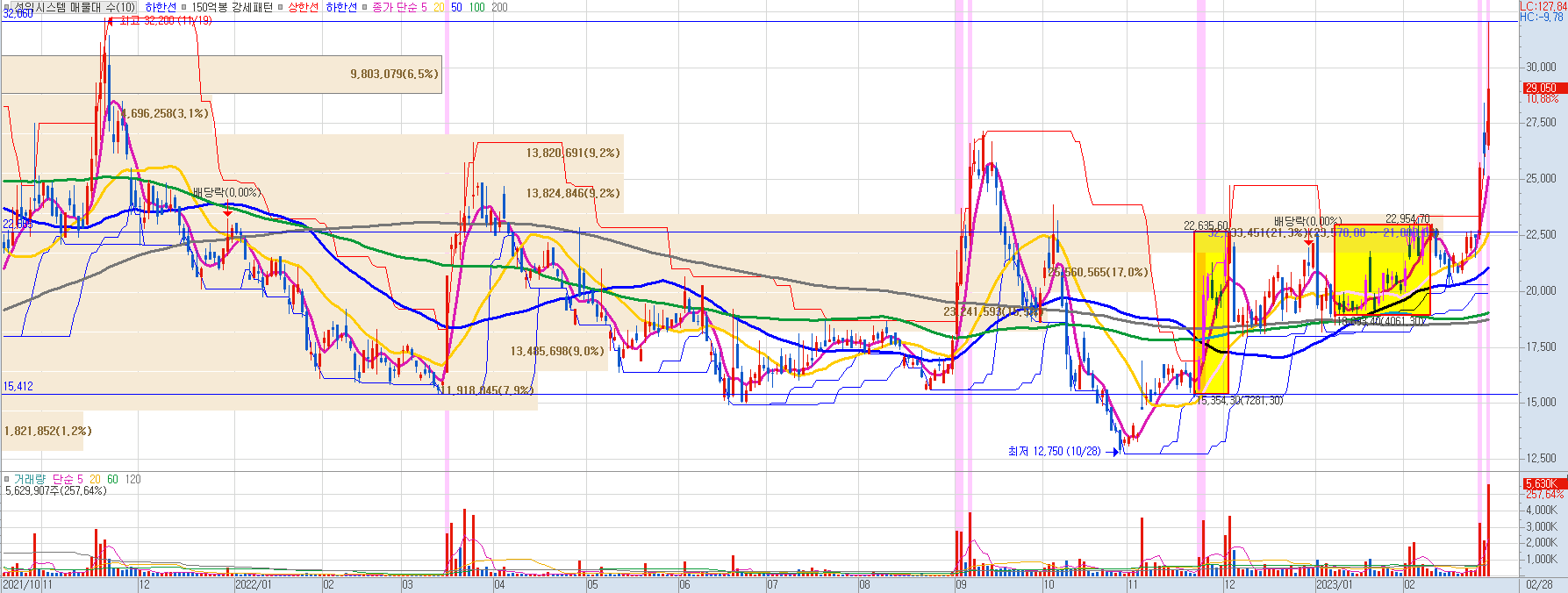 23.02.28 장중 한때 기록한 고가 32,000원은 21.11.19에 기록한 고점인 32,200원과 거의 근접한 상황에서 크게 윗꼬리를 달았습니다. 결국 종가는 전일 대비 10.88% 상승한 29,050원에서 마무리됐습니다. 전고점에서 큰 저항에 부딪혀 장대 윗꼬리를 단 만큼 단기 방향성이 하락으로 전환되는지에 대한 추적이 필요합니다.