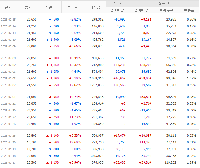 23.02.15 외인 보유율은 0.26%이며 외인 및 기관의 거래량 자체가 적은 편입니다.
