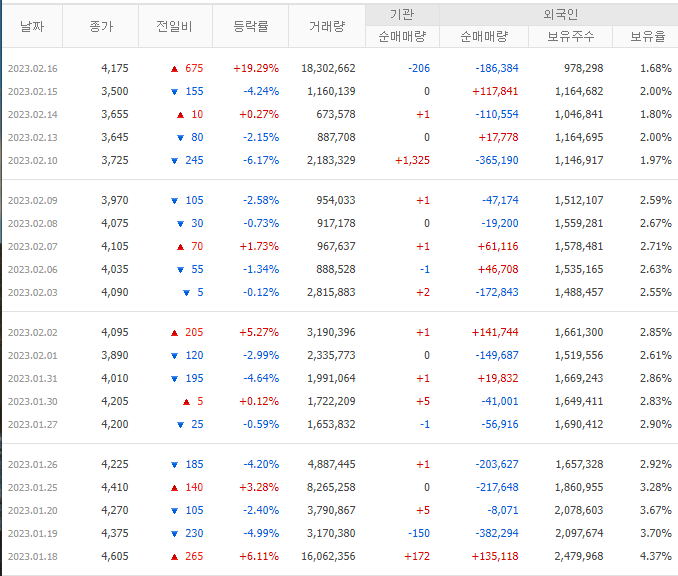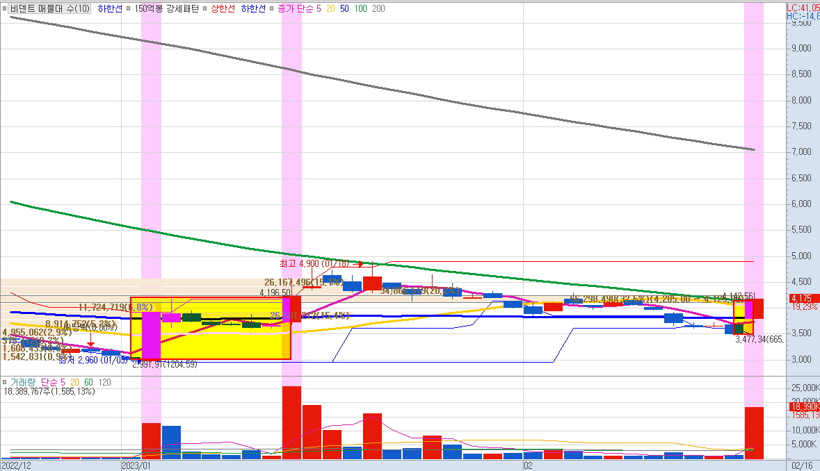 비덴트의 23.02.16 기준 주가는 4,175원으로 전일 대비 19.29%에 달하는 큰 폭의 상승을 기록했습니다. 당일 새벽 비트코인, 이더리움 등 코인이 큰 폭의 상승을 보이면서 관련주인 비덴트 또한 급등을 이룰 수 있었습니다.