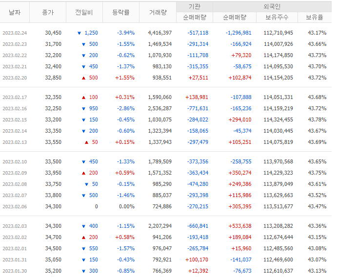23.02.24 기준 외인 보유율은 43.17%이며 외인 보유 비중이 높은 종목입니다. 다만, 최근 이어진 악재로 기관 순매도세가 이어지고 있으며, 2/24 외인의 대량 매도세가 발생하고 있습니다. 앞서 언급한 악재들이 주원인으로 예상됩니다.