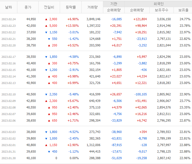 23.02.24 기준 외인 보유율은 24.77%이며 최근 거래 내역을 통해 기관에 비해 외인의 관심이 더 큰 종목임을 알 수 있습니다.
