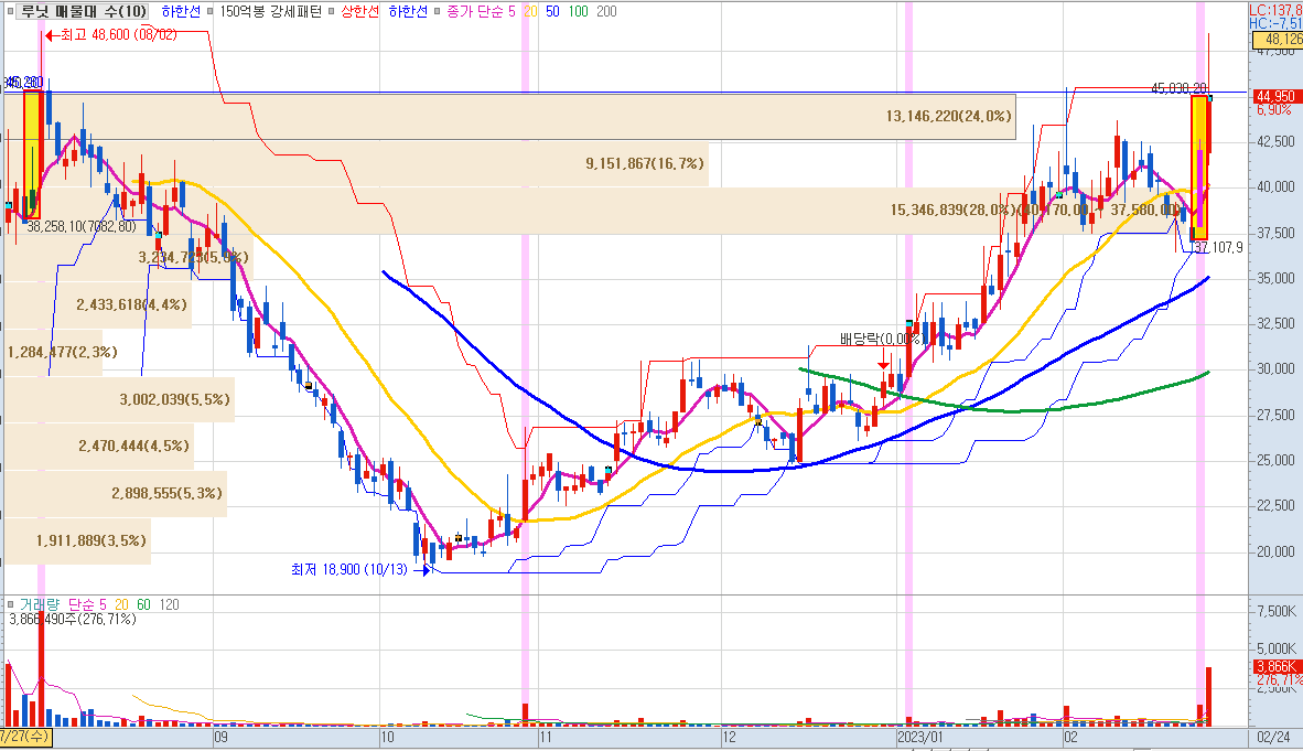 루닛의 23.02.24 기준 주가는 44,950원으로 전일 대비 6.9%를 기록했습니다. 상장 직후 나타났던 전고점을 일시적으로 돌파하면서 48,500원까지 고점을 기록한 후 저항에 부딪히면서 현재 종가를 기록하고 있습니다. 최근 챗GPT의 영향으로 AI 관련주에 수급이 몰리면서 루닛도 큰 폭의 매수세가 유입되어 추가 상승의 기대감이 있습니다. 하지만 AI가 아닌 다른 이슈로 22년 10월 중순부터 지속적으로 상승해 왔기 때문에 주가에 대한 느낄 수도 있는 점은 참고할 필요가 있습니다.