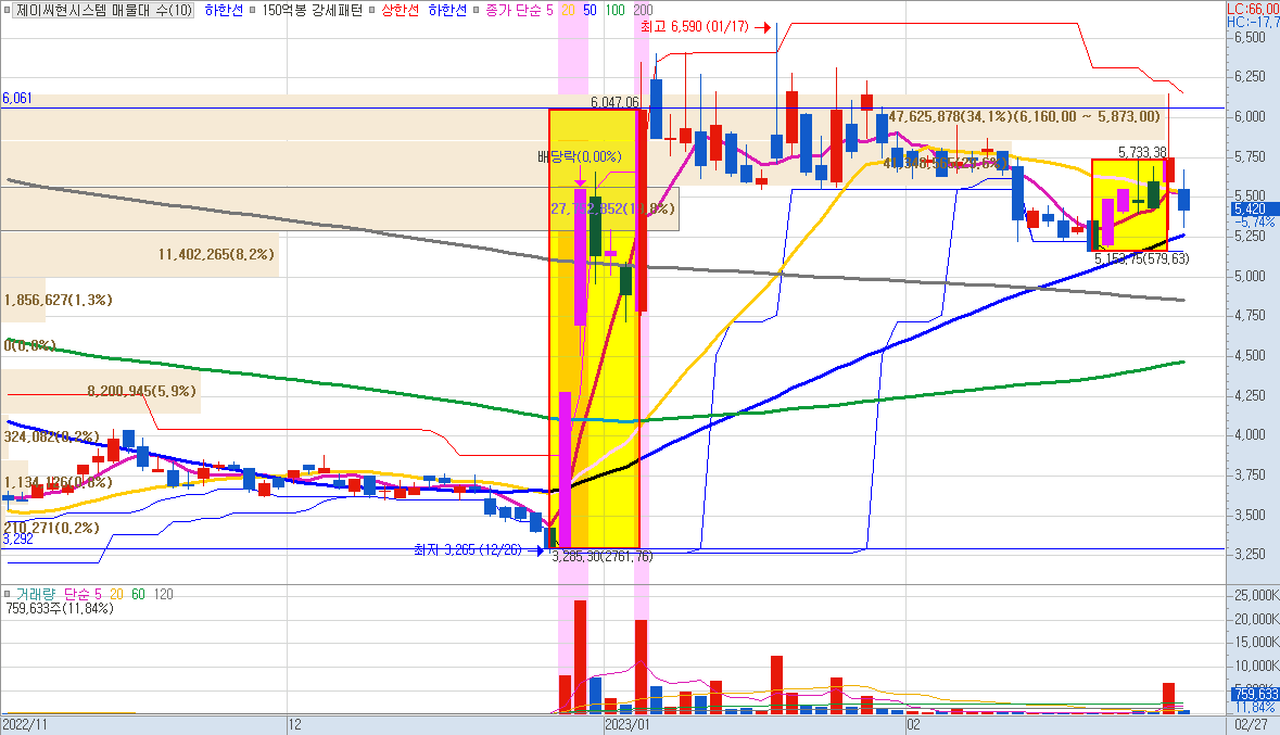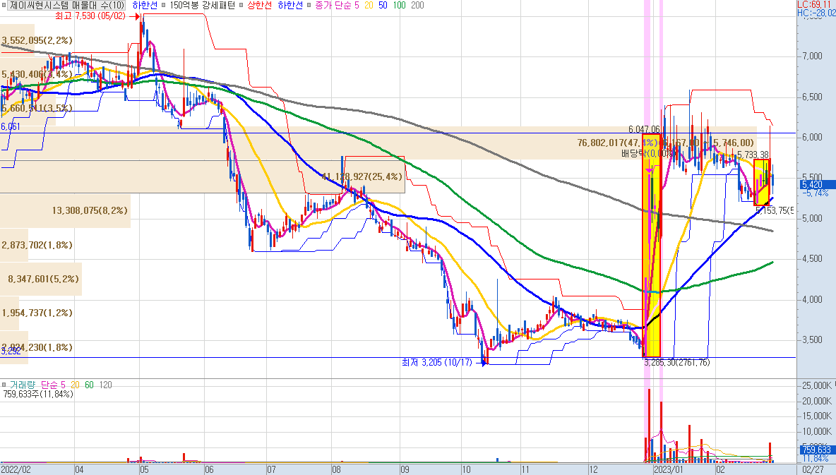 제이씨현시스템의 23.02.27 기준 주가는 5,420원으로 전일 대비 -5.74%를 기록했습니다. 22년 말~23년 초 큰 상승 후 주가가 크게 밀리지 않고 횡보하는 모습을 보여주고 있습니다. 주가가 크게 밀리지 않는다면 재차 상승을 보유줄 수도 있는 상황입니다.
