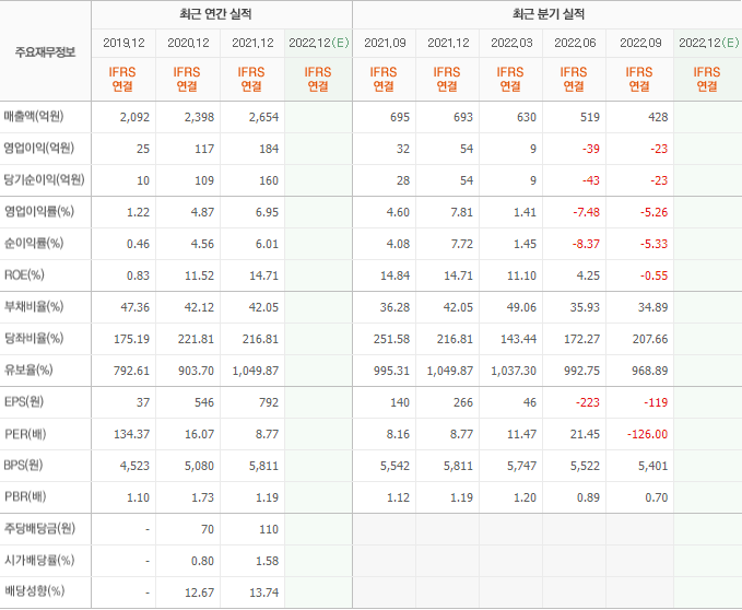 22년 실적은 이전 대비 하락할 것으로 예상됩니다. 하지만 부채비율과 유보율이 건전한 편이기 때문에 당장 재무가 흔들릴 상황은 아니라고 판단됩니다.