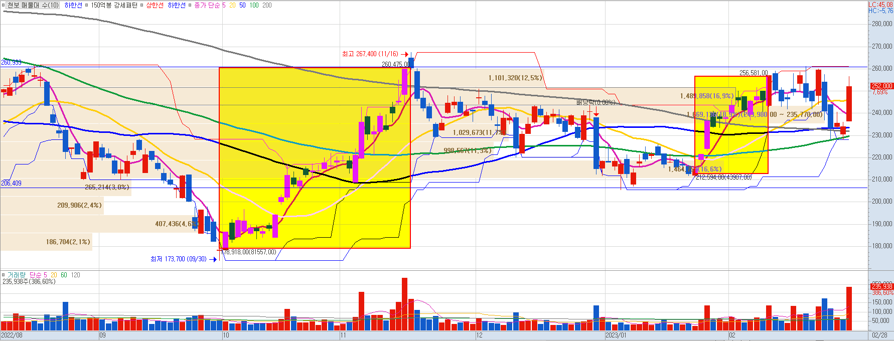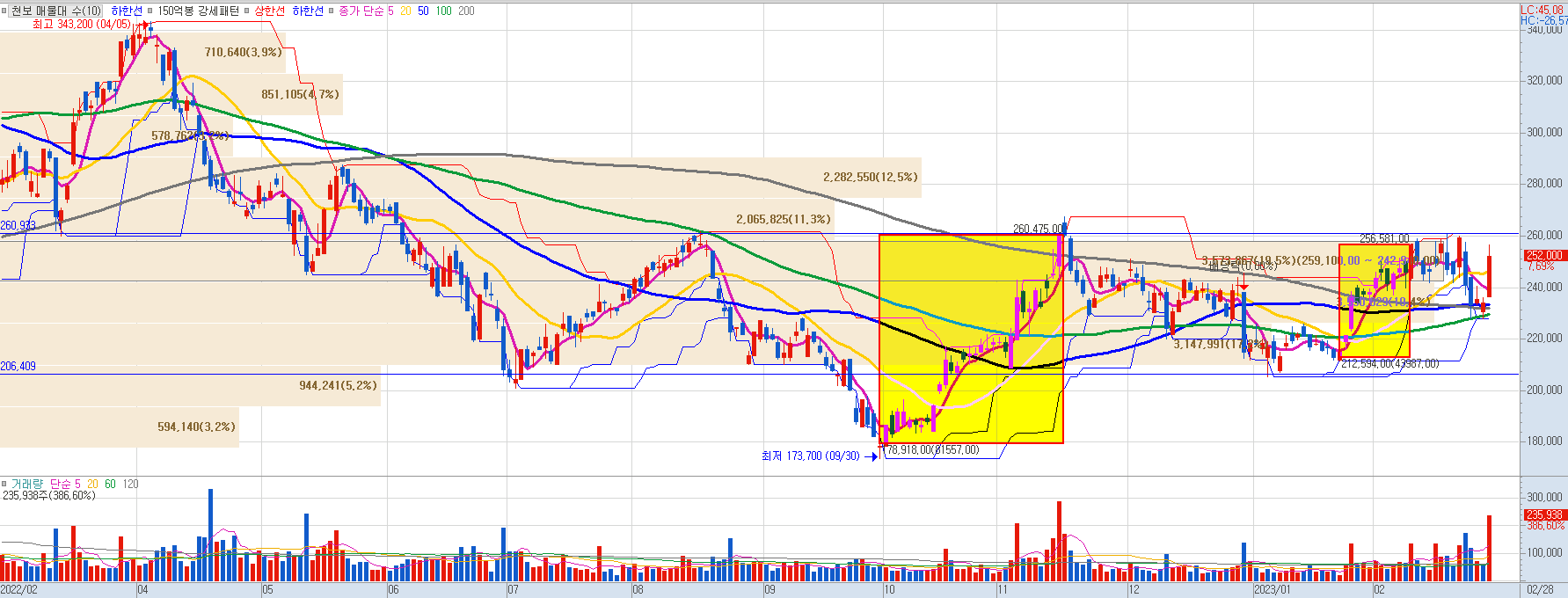 천보의 23.02.28 기준 주가는 252,000원으로 전일 대비 7.69%를 기록했습니다. 단기적으로 약 28만 주의 거래량을 기록한 22.11.15 이후 약 25~26만 원의 저항선을 다시 두드리고 있습니다. 2/28 약 23만 주의 거래량과 함께 다시 접근하고 있기 때문에 돌파 시 추가적인 상승을 기대할 수 있습니다. 또한, 투심이 악화되지 않는다면 일시적인 하락을 추가 매수 관점으로 접근해도 될 것 같습니다. 다만, 여전히 인플레이션 우려로 인한 투심 악화가 발생할 수 있기 때문에 손절 기준은 항상 필요합니다.