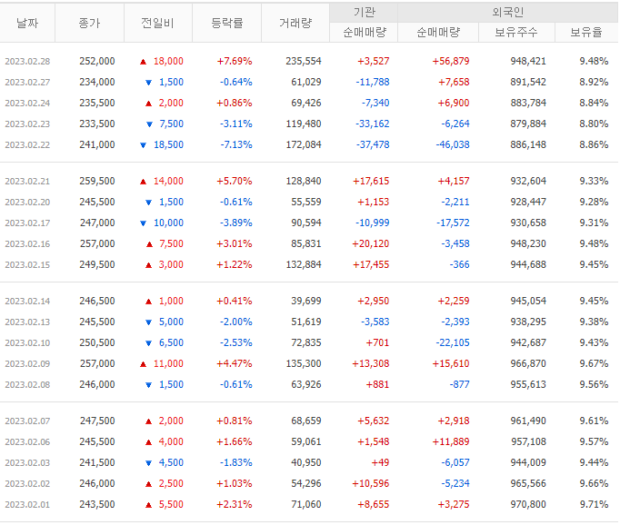 | 금일 종가 | 252,000원 |