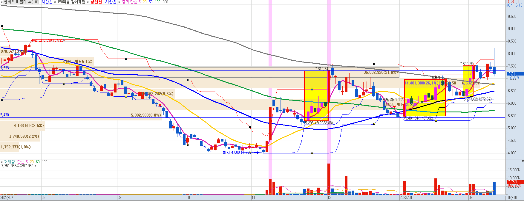 엔비티의 23.02.10 현재 주가는 7,200원으로 전일 대비 -2.83%를 기록했습니다. 약 7,500원까지 상승했던 주가가 흔들리면서 다시 상승할 수 있는지에 대한 지속적인 확인이 필요합니다.