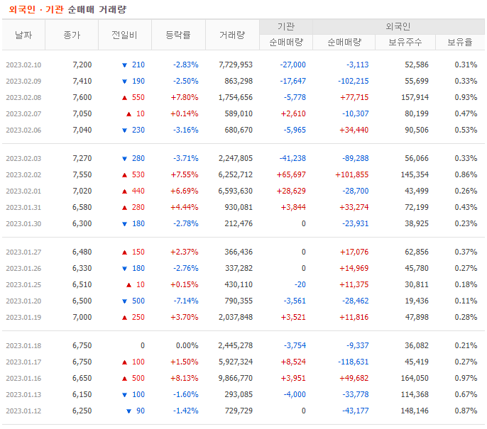 23.02.10 현재 외인 보유율은 0.31%이며 기관의 관심도 크게 가지지 못한 종목으로 수급의 주체가 개인임을 알 수 있습니다.