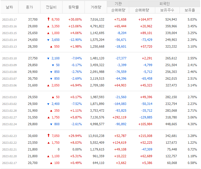 23.03.17 기준 외인 보유율은 5.03%이며 전일 대비 외인의 대량 매수로 보유율이 1.6% 상승했습니다. 기관 또한 큰 폭의 순매수를 기록하며 상한가 달성에 영향을 줬습니다.