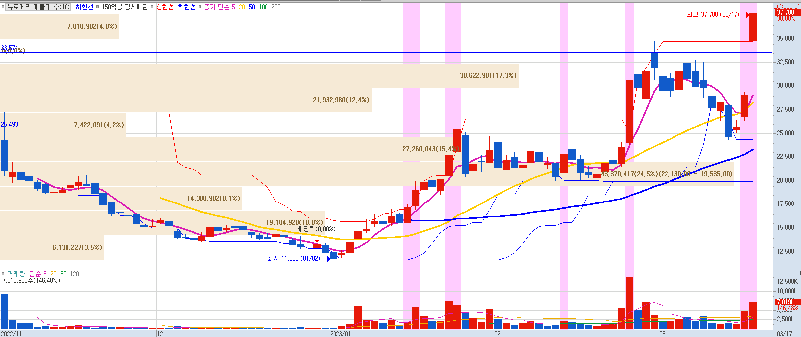 뉴로메카의 23.03.17 기준 주가는 37,700원으로 전일 대비 30% 상승하며 상한가를 기록했습니다. 상한가를 기록한 이유는 대기업 로봇 인수전 이슈 때문인 것으로 생각됩니다. 주가의 추가 상승이 지속될 수는 있으나, 시초부터 거의 20%에 달하는 갭상승을 보여줬습니다. 이런 경우 단기 급락을 통해 갭을 메꿔주는 움직임이 발생할 수도 있기 때문에 단타 관점에서 접근하는 것이 유리할 것으로 보입니다.