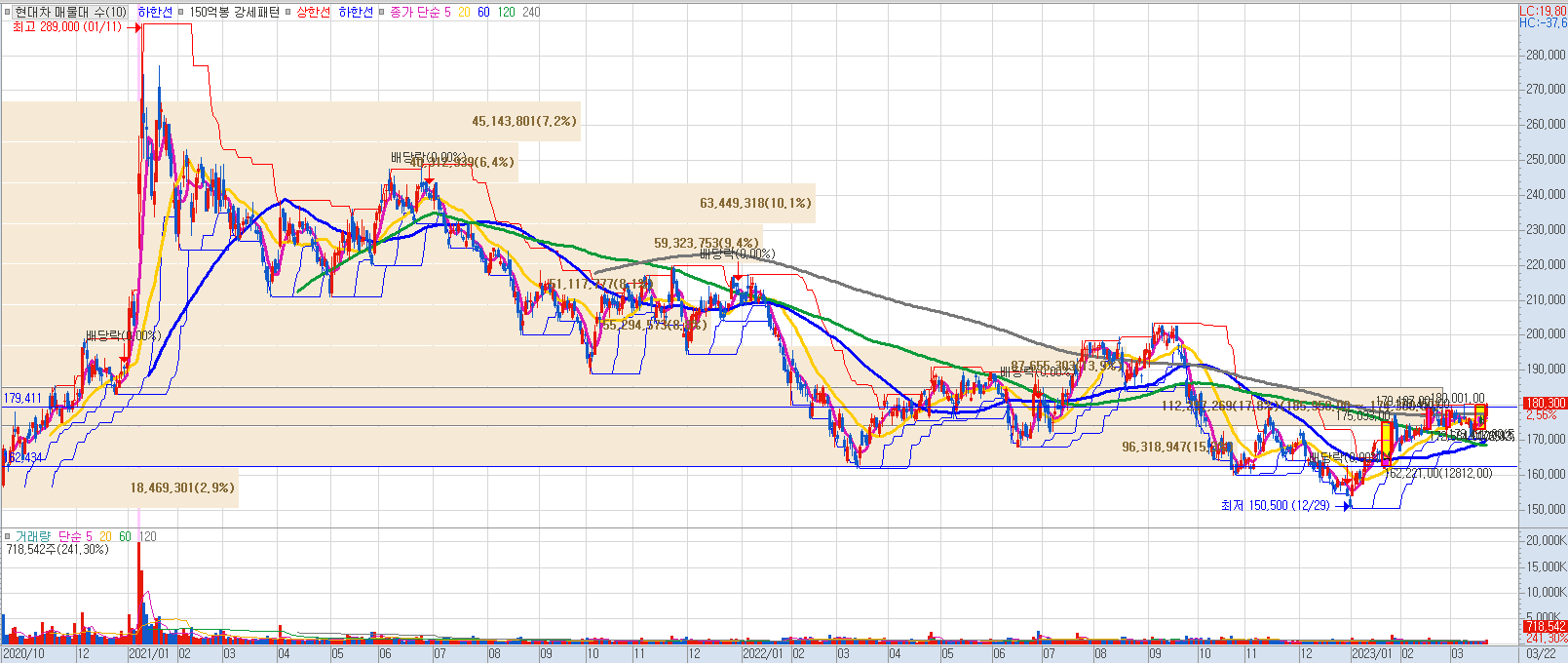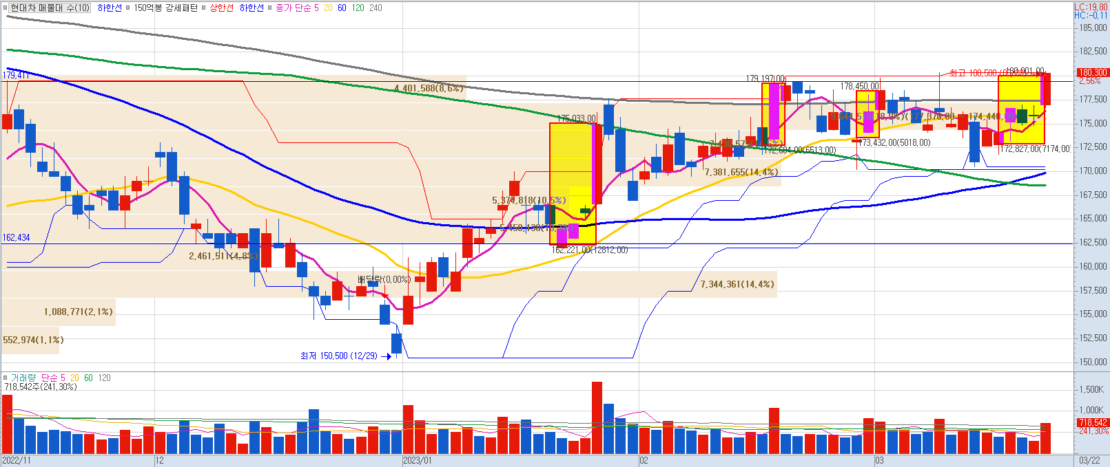 현대차의 23.03.22 기준 주가는 180,300원으로 전일 대비 2.56%를 기록했습니다. 약 180,000원을 단기 고점으로 주가가 횡보하는 상황에서 소폭 돌파하는 모습을 보여줬습니다.