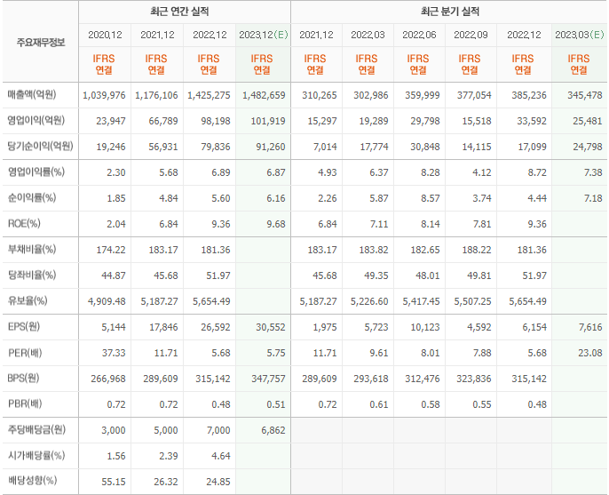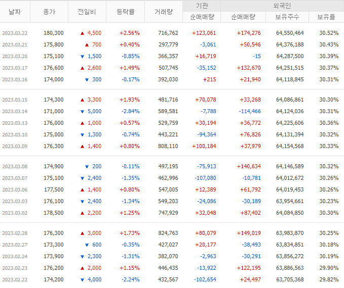 23.03.22 기준 외인 보유율은 30.52%로 외인의 관심이 큰 편에 속하는 종목입니다. 23.02.22 외인 보유율 대비 0.7%의 보유율이 상승하면서 큰 폭의 매수세를 보여주고 있습니다.