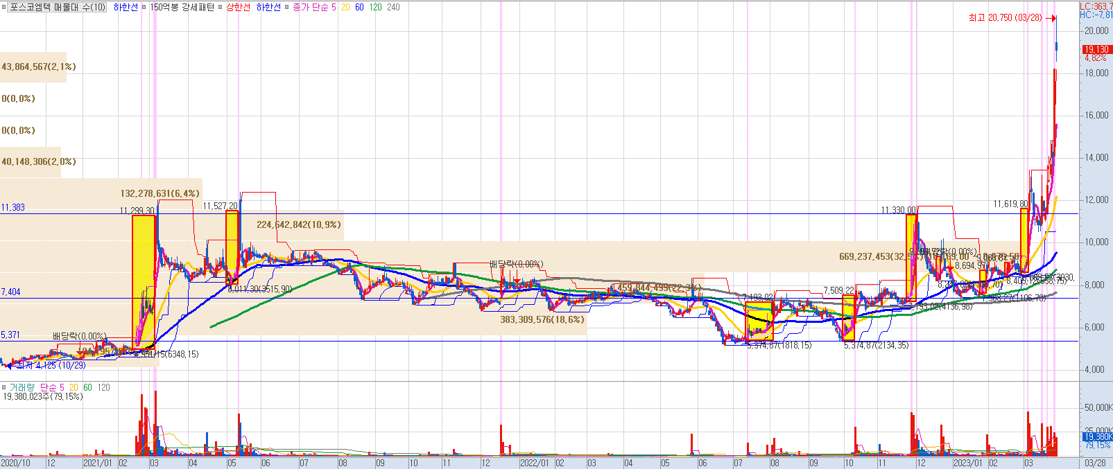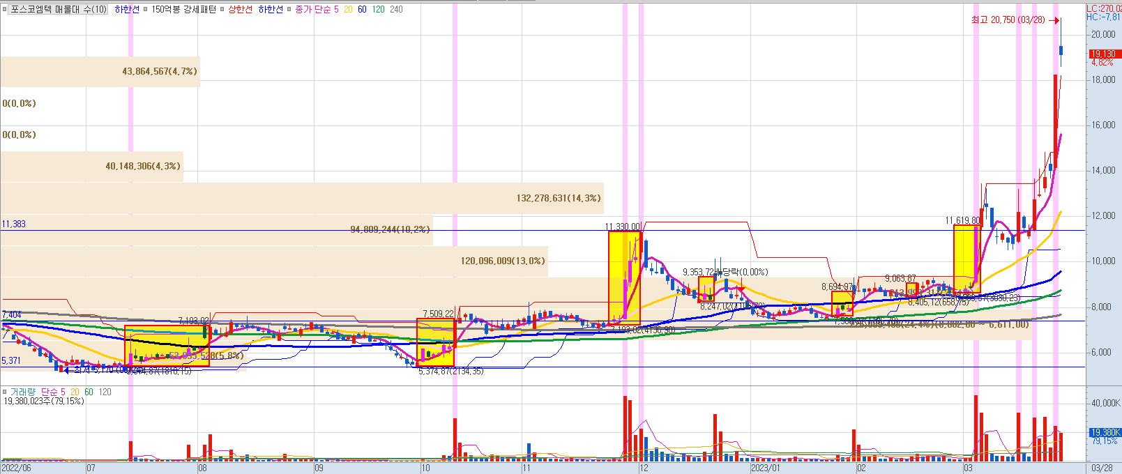 포스코엠텍의 23.03.28 기준 주가는 19,130원으로 전일 대비 4.82%를 기록했습니다. 전일인 23.03.27의 경우 상한가인 29.99%를 기록했습니다. 단기적으로는 22.11.28~22.12.01의 기간 동안 큰 거래량이 발생했고, 23.03.06에 비슷한 규모의 거래량이 발생하면서 추가적인 상승 시그널이 발생했습니다.