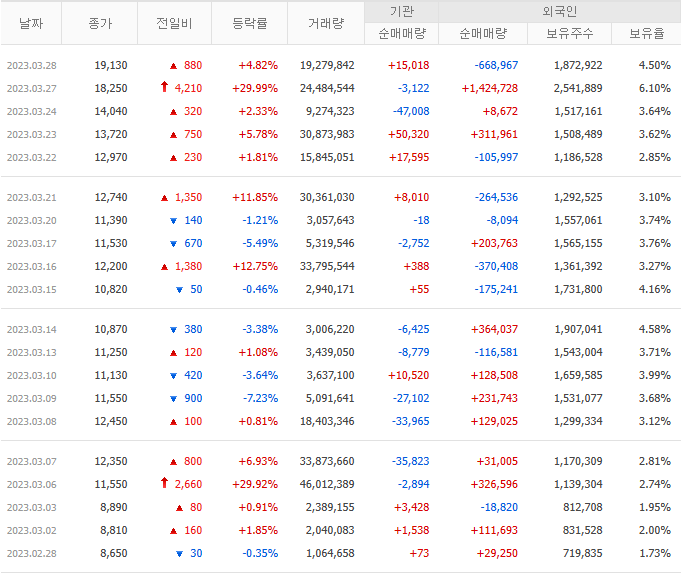 23.03.28 기준 외인 보유율은 4.5%로 전일 대비 -1.6%의 감소가 이어졌습니다. 3/28 현재 외인의 자금이 상승으로 인한 수익 실현 움직임이 보입니다.