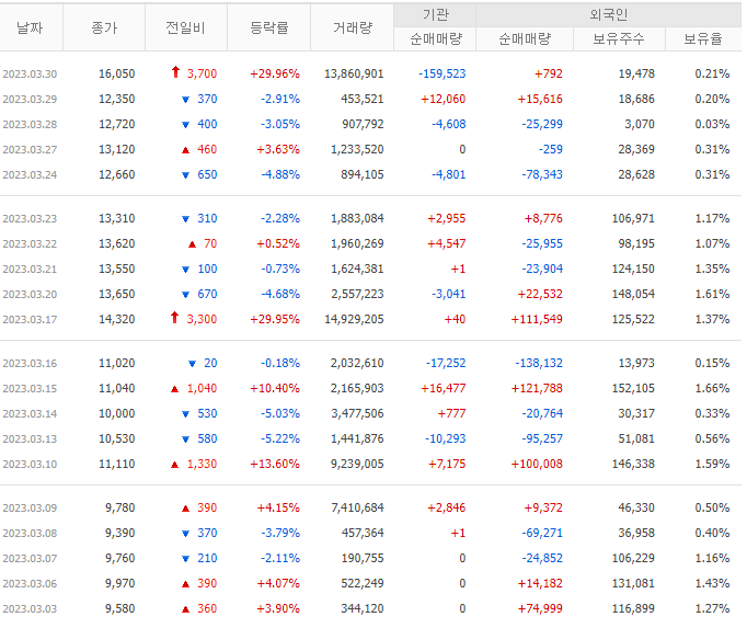 23.03.30 기준 외인 보유율은 0.21%이며 기관의 관심 또한 적은 편입니다. 특히 기관의 순매도와 외인의 소폭 매수세에도 불구하고 상한가 달성했기 때문에 개인의 강한 매수세가 나타난 것으로 보입니다.