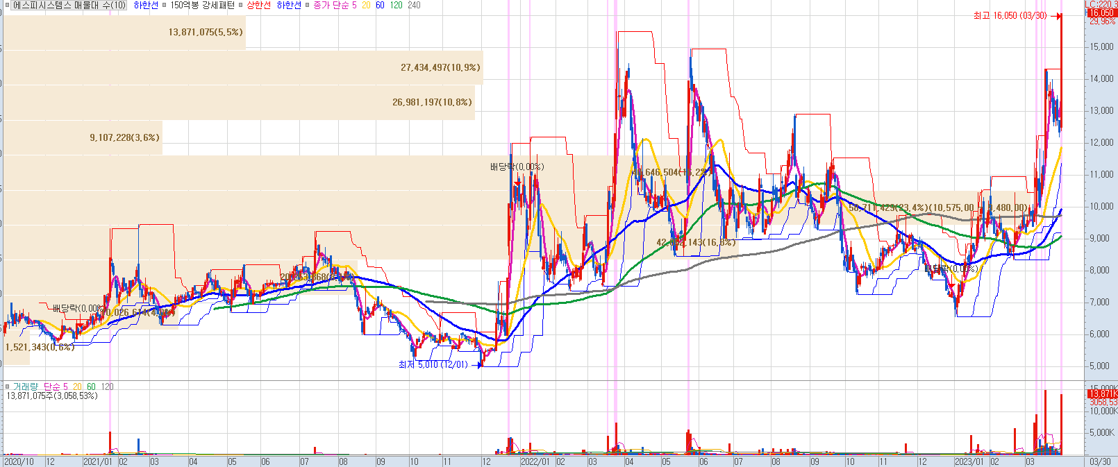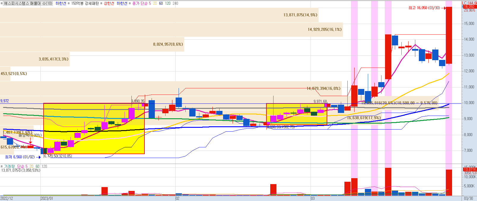 에스피시스템스의 23.03.30 기준 주가는 16,050원으로 전일 대비 29.96% 상승하며 상한가를 기록했습니다. 로봇 관련 이슈를 통해 3/17 큰 폭의 상승 후 단기적으로 하락하며 20일 이동평균선과 근접할 때쯤 2차 전지 관련 소식이 나타나면서 다시 한번 급등하고 있습니다.