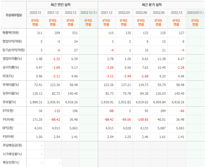에스피시스템스는 22년 큰 실적 개선이 이뤄지면서 매출, 영업이익, 순이익 모두 성장하는 모습을 보여줬습니다. 특히, 21년 대비 흑자전환을 보여주면서 긍정적인 실적이 나타났습니다.
