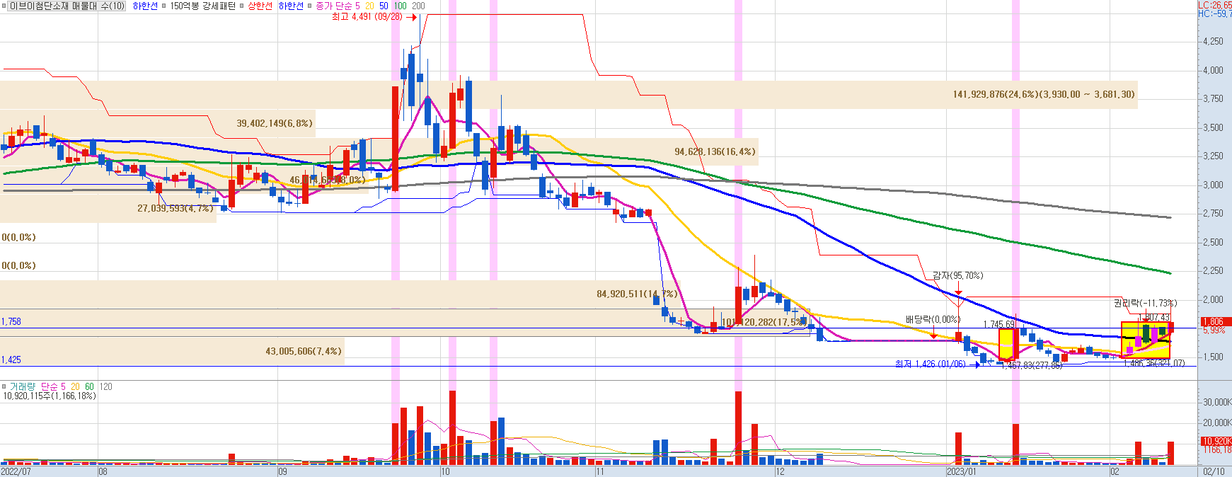 이브이첨단소재의 23.02.10 현재 주가는 1,806원으로 전일 대비 5.99%를 기록했습니다. 최근 감자 소식 및 시장 유동성 악화로 크게 하락했지만 전기차에 확대 영향으로 다시 상승할 수 있을지에 대한 지속적인 확인이 필요합니다.