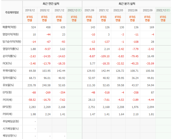19년 이후 지속적인 적자에 시달리고 있습니다. 21년 이 후 유보율도 50%대로 떨어진 상황이라 재무 상태가 건전하다고 할 수는 없을 것 같습니다. 다만, 22년 3분기 흑자를 기록한 점이 긍정적이며, 4분기 이후의 실적도 흑자로 돌아설 수 있을지에 따라 주가 흐름이 달라질 수 있습니다.