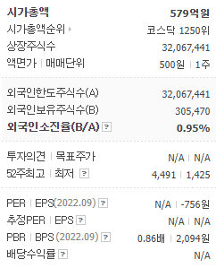 현재 시가총액은 579억이며, 액면가는 500원입니다.