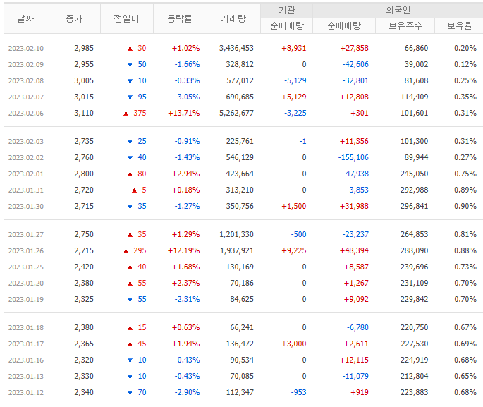 23.02.10 현재 외인 보유율은 0.2%이며 기관과 외국인의 관심이 적은 종목으로 생각됩니다.