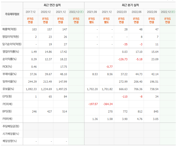 21년 대비 22년의 매출액은 비슷할 것으로 예상되나 22년 간 적자 발생으로 유보율이 감소한 것은 우려할 포인트라고 생각됩니다. 다만 여전히 유보율과 부채율이 좋은 편이기 때문에 성장 여력은 충분할 것으로 보입니다.