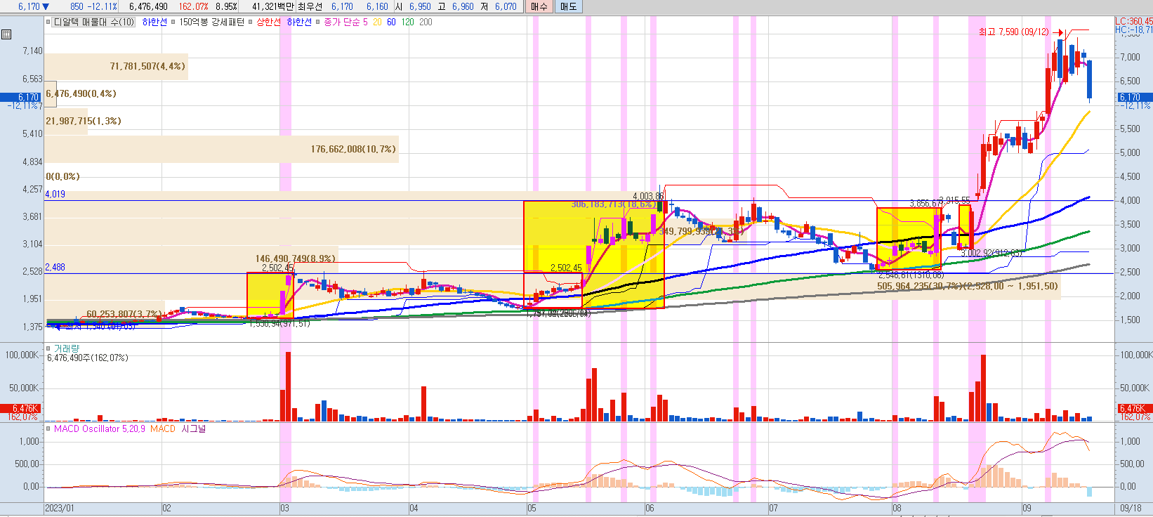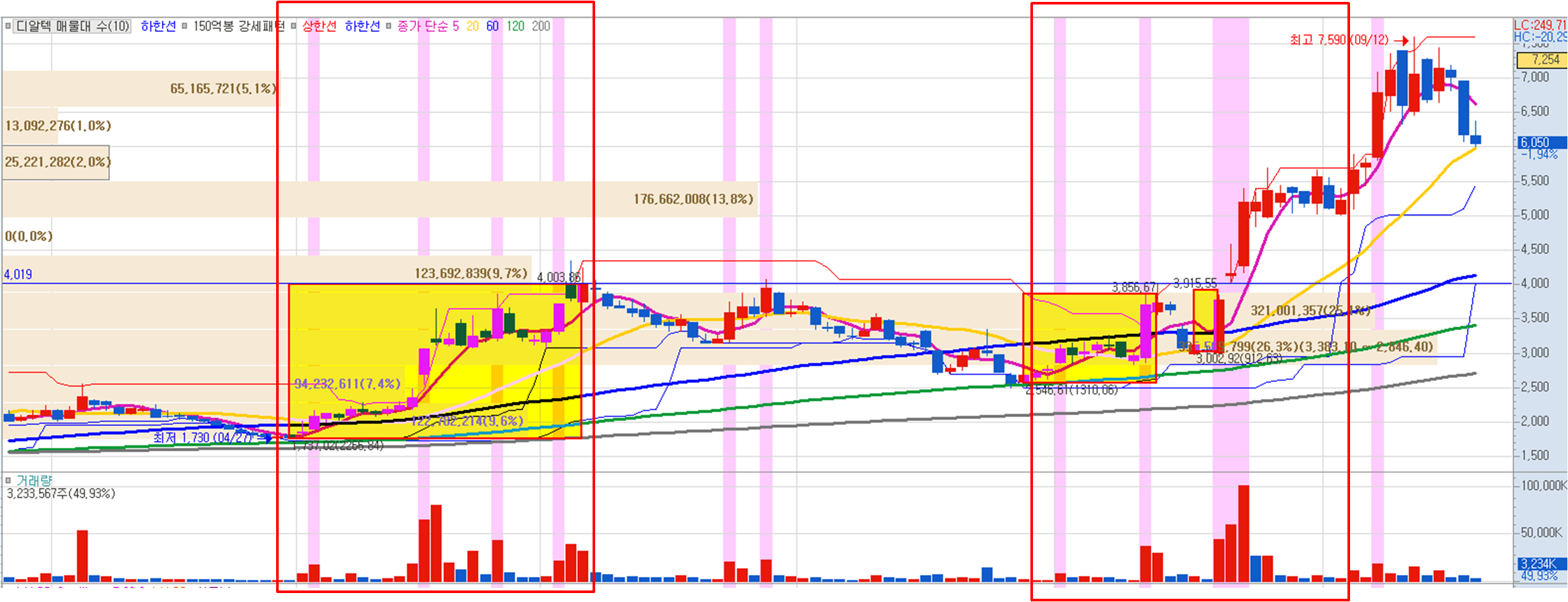 물론 발견을 못했지만 만약 발견했다면 1차 시점 5/16~5/17 주가 약 2,500원 도달 시점. 2차 8/21 약 4,000원 도달 시점이었겠으나, 추가 상승 여력에 대한 확신이 없어 매수는 못했을 듯하다. 그렇다면 단기 전고점을 어떻게 돌파하고 추가 상승세를 이룰 수 있었을까에 대한 궁금증이 생긴다.