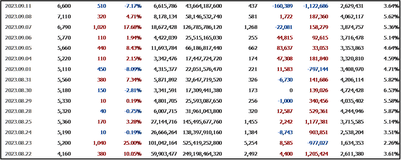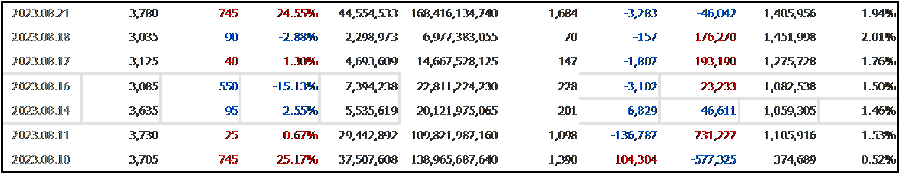 차트에서 이동평균선 기준으로는 23년 5월 이후로 120일 선을 단기 저점으로 주가가 흘러가고 있음. 7/26에 발생한 단기 저점의 경우 3/3에 발생한 단기 고점을 지지선 기준으로 적용된 듯함. 3/2, 3/3 이틀 간 약 3500억의 거래대금이 발생함. 대량의 거래량이 발생하면서 발생한 대량의 매물대가 지지선이 된 것으로 추정.